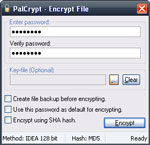 PalCrypt là phần mềm mã hóa rất dễ sử dụng, giúp đảm bảo rằng các file của bạn sẽ được bảo vệ bằng mật khẩu khỏi truy cập ẩn danh. Người dùng có thể chọn 2 lựa chọn bảo vệ file. Phải chuột vào bất kì file nào và chọn “Encrypt with PalCrypt 2.1.1.9” để mã hóa nó từ Windows Explorer. Ngoài ra, người dùng có thể chạy phần mềm PalCrypt Quick Start và mã hóa/giải mã bất kì file nào tại đây. Nhà sản xuất khẳng định rằng phần mềm này được thiết kế để chống lại ngay cả tấn công mạnh mẽ nhất. Phần mềm này đã được phát triển với các phương pháp đặc biệt nhằm tránh tấn công vét cạn và những ý đồ truy hồi mật khẩu. Tuy nhiên, họ cảnh báo người dùng rằng mã hóa IDEA 128-bit mạnh tới mức nó không thể giúp những ai mất hoặc đặt nhầm mật khẩu. Điều tốt nhất của phần mềm này là khả năng truy cập của nó – nó hoàn toàn tích hợp với Windows vậy nên bạn có thể truy hồi bất kì lúc nào.
