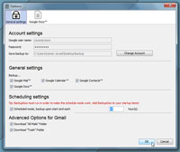 Ngoài ra trong tab General settings , bạn có thể thay đổi account khác trong khung Account settings , lên lịch sao lưu trong ô Scheduled mode, backup upon start and each hay có thể bỏ chọn trong ô Download “track” Folder nếu muốn không sao lưu các thư đã bị xóa.