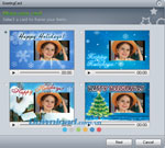 VideoFlick cung cấp cho bạn một số mẫu thiệp điện tử đẹp mắt. Công việc của bạn chỉ đơn giản là chọn ảnh hoặc video cần chèn vào thiệp, sau đó chọn chức năng Card từ thanh công cụ. Trên hộp thoại Greeting card , bạn chọn một mẫu thiệp ưa thích, nhấn nút Play (hình tam giác ngang) để xem thử. Xong, bạn nhấn Next và điền thông tin người nhận tương tự như khi gửi email, rồi nhấn Share để gửi thiệp.